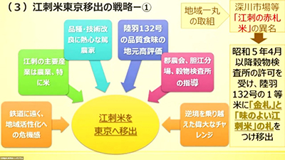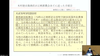 江刺米の販売を委ねられた「木村徳兵衛商店」は、販路開拓に奔走し、その評判やコメ市場の様子を郡農会に頻繁に伝えていた。農家はこれに応え、産米改良に一層努めたのだ。